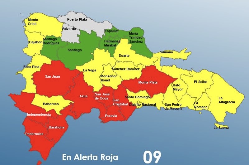 Las provincias en alerta roja son Barahona, San Cristóbal, Independencia, San José de Ocoa, Monte Plata, San Juan, Azua, Peravia y Pedernales.