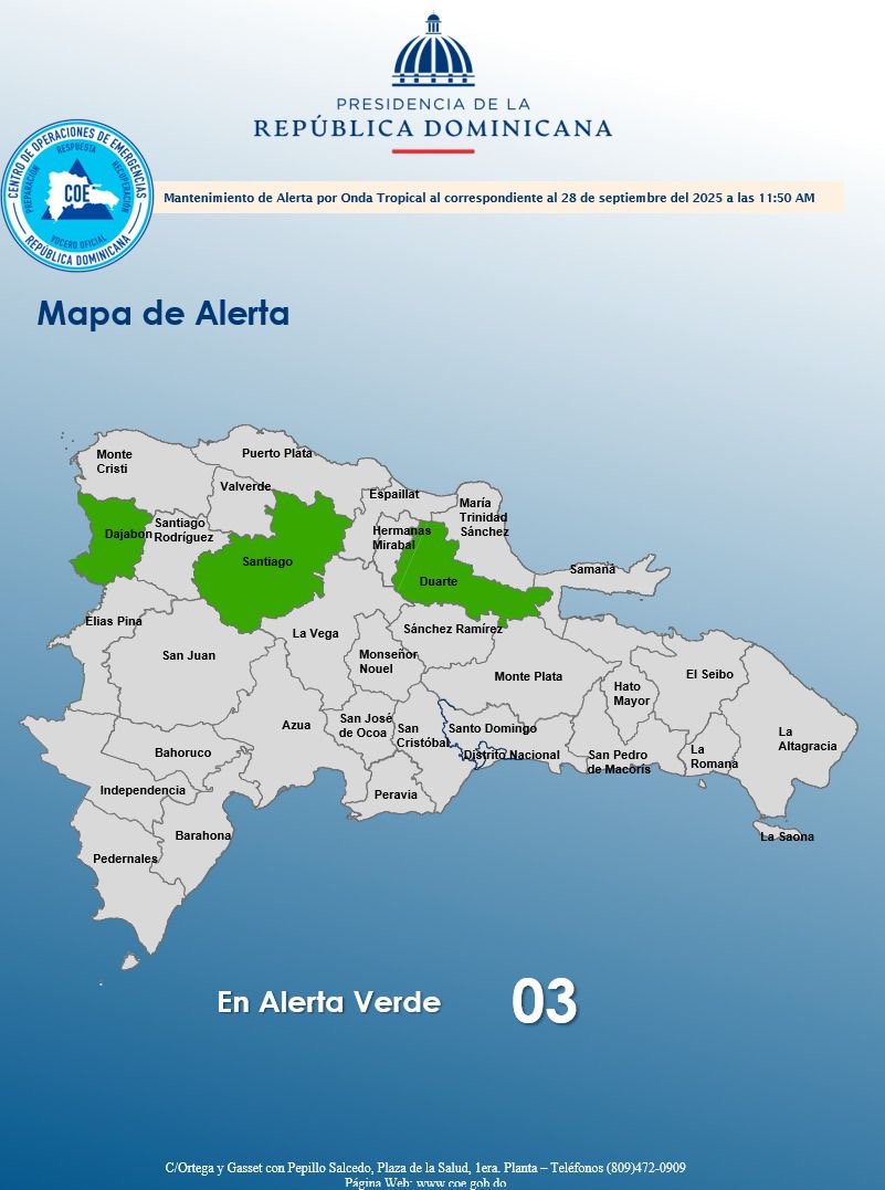 El Centro de Operaciones de Emergencias (COE) mantiene este domingo en alerta verde a las provincias Dajabón, Santiago y Duarte, debido a los aguaceros y tormentas eléctricas que se esperan durante la tarde y primeras horas de la noche, según el más reciente informe de la Oficina Nacional de Meteorología (Onamet).