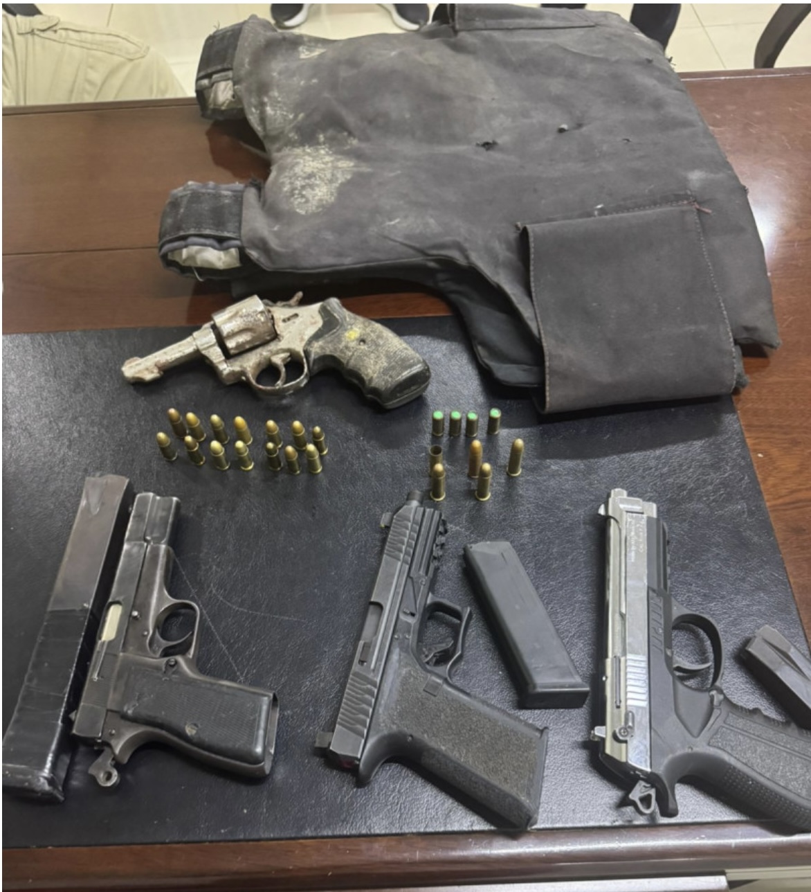 En el lugar del enfrentamiento se incautaron varias armas de fuego, incluyendo una pistola FEG Carandai calibre 9 mm con un cargador de 30 cápsulas (de las cuales contenía nueve), una Glock calibre 9 mm sin numeración con su cargador y cinco cápsulas, un revólver calibre .38 con cuatro cápsulas y un casquillo, y una pistola de fogueo con cuatro cápsulas. Además, se encontró un chaleco antibalas en poder del grupo.